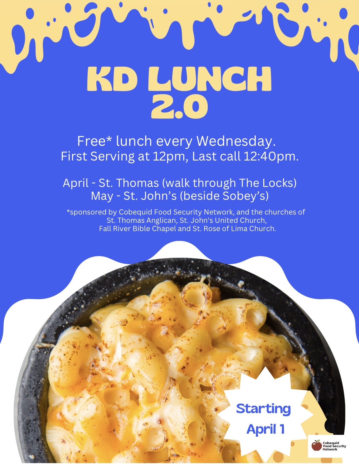 A ‘free’ lunch of KD dinner with healthy side dishes for Lockview high school students provided by the churches of Fall River and Oakfield and the Cobequid Food Security network. In April it’s held at St. Thomas Anglican Church (walk there through the locks) and May at St. John’s United (next to the Sobey’s). Serving begins at noon and ends at 12:40 p.m. Volunteers please contact Rev. Michael at tuttoncp@gmail.com.